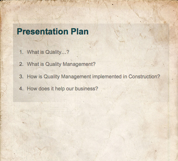 This is a very simple and quick presentation for an introduction to the senior Management of a construction company (e.g. contractor). These 16 slides will help someone who has never been involved in quality management to understand why we need it in construction industry. This comes as a Powerpoint Presetnation that you can edit as you wish.